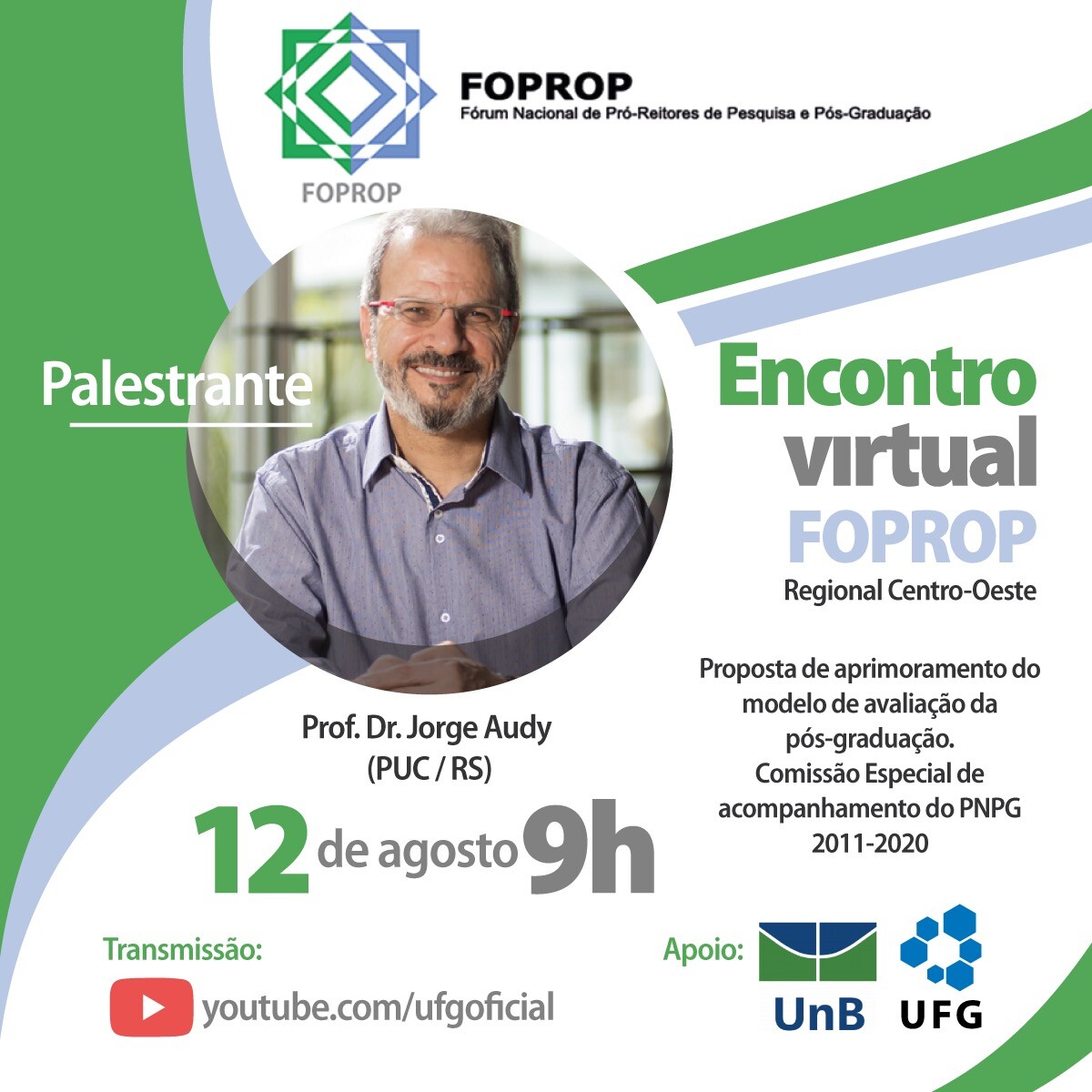 O encontro virtual do Fórum Nacional de Pró-Reitores de Pesquisas e Pós-Graduação da Regional Centro-Oeste (FOPROP-CO) acontece dia 12 de agosto, às 9h, com transmissão ao vivo no canal oficial da UFG no Youtube.
