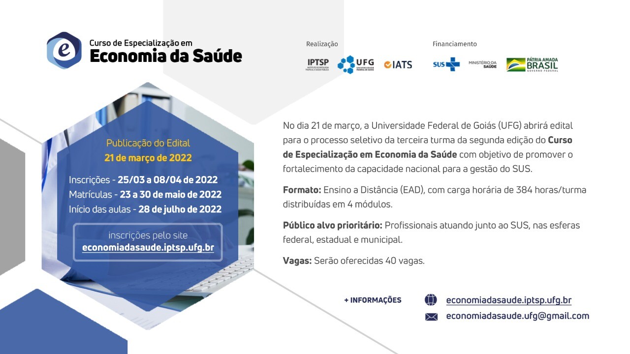 O edital com todas as informações do processo seletivo está disponível no site https://economiadasaude.iptsp.ufg.br. Mais informações no site https://economiadasaude.iptsp.ufg.br ou pelo e-mail economiadasaude.ufg@gmail.com.